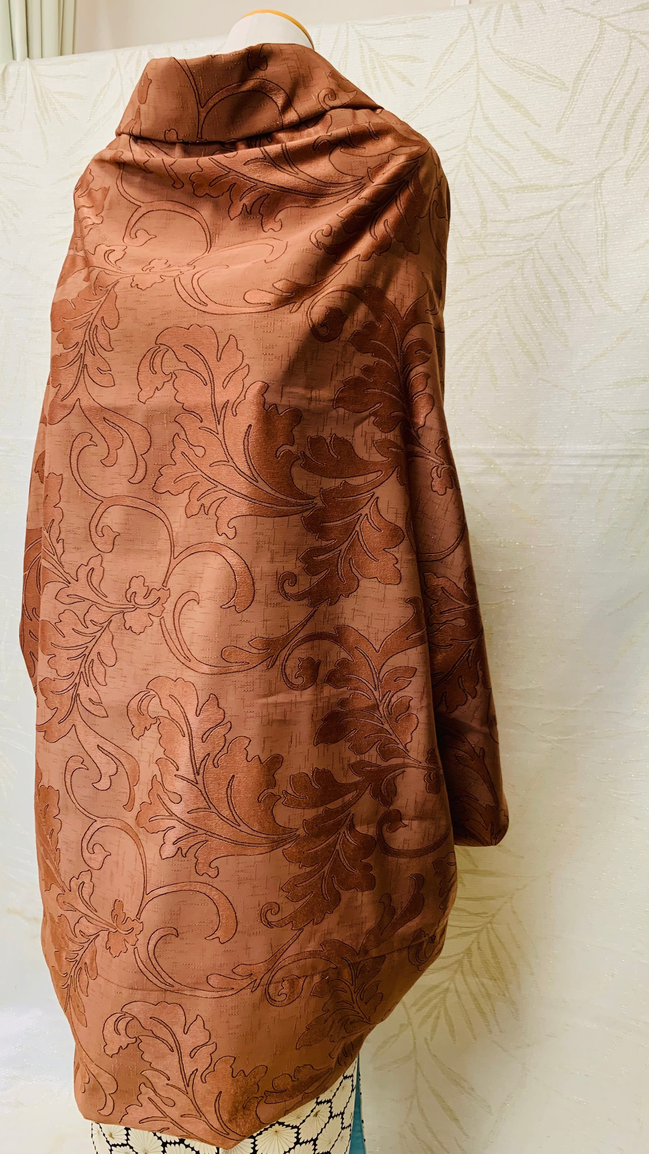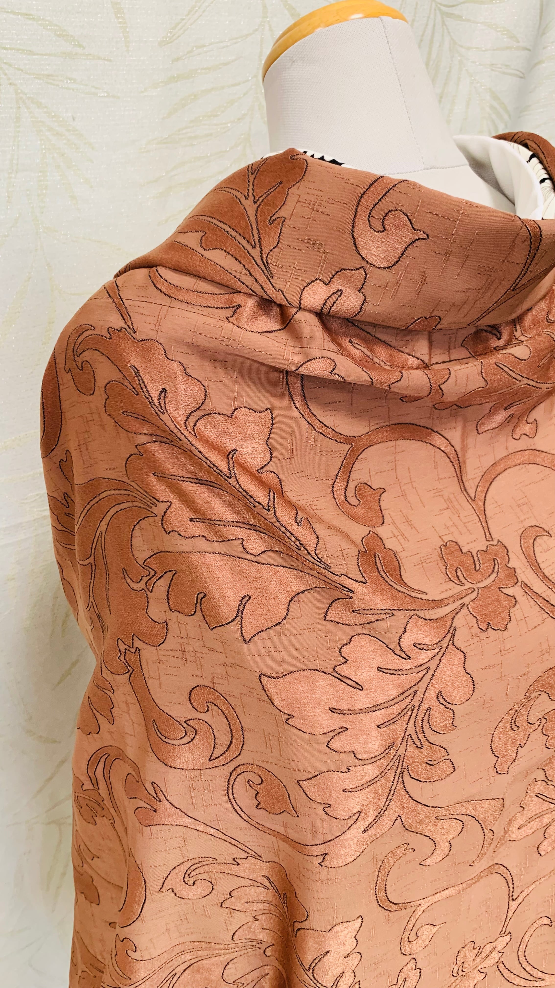 落ち着きのあるブラウンにアクセントの葉柄がとても目立つ織り生地です。